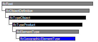 An IfcGeographicElementType is used to define an element specification of a geographic element (i.e. the specific product information, that is common to all occurrences of that product type). Geographic element types include for different types of element that may be used to represent information within a geographical landscape external to a building. Within the world of geographic information they are referred to generally as 'features'. IfcGeographicElementType's include: