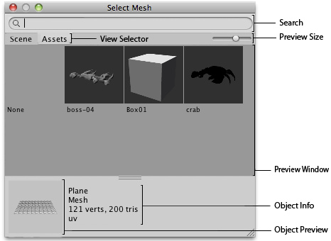 The Object Picker works on any asset you have in your project, which can be a video, a song, a terrain, a GUI skin, a scripting file, or a mesh; it is a tool you will use often.